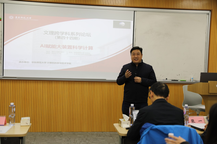 最后数据科学与工程学院党委书记王长波教授代表视觉与媒体智能团队致辞。他首先对各位专家莅临华师大指导工作表示欢迎,并指出人工智能带来的深层次变革席卷所有的行业;本次论坛紧扣科学计算这一国家战略需求,具有重要的意义和价值。他期待与会者通过交叉研讨,共同为大科学装置的未来发展贡献智慧。