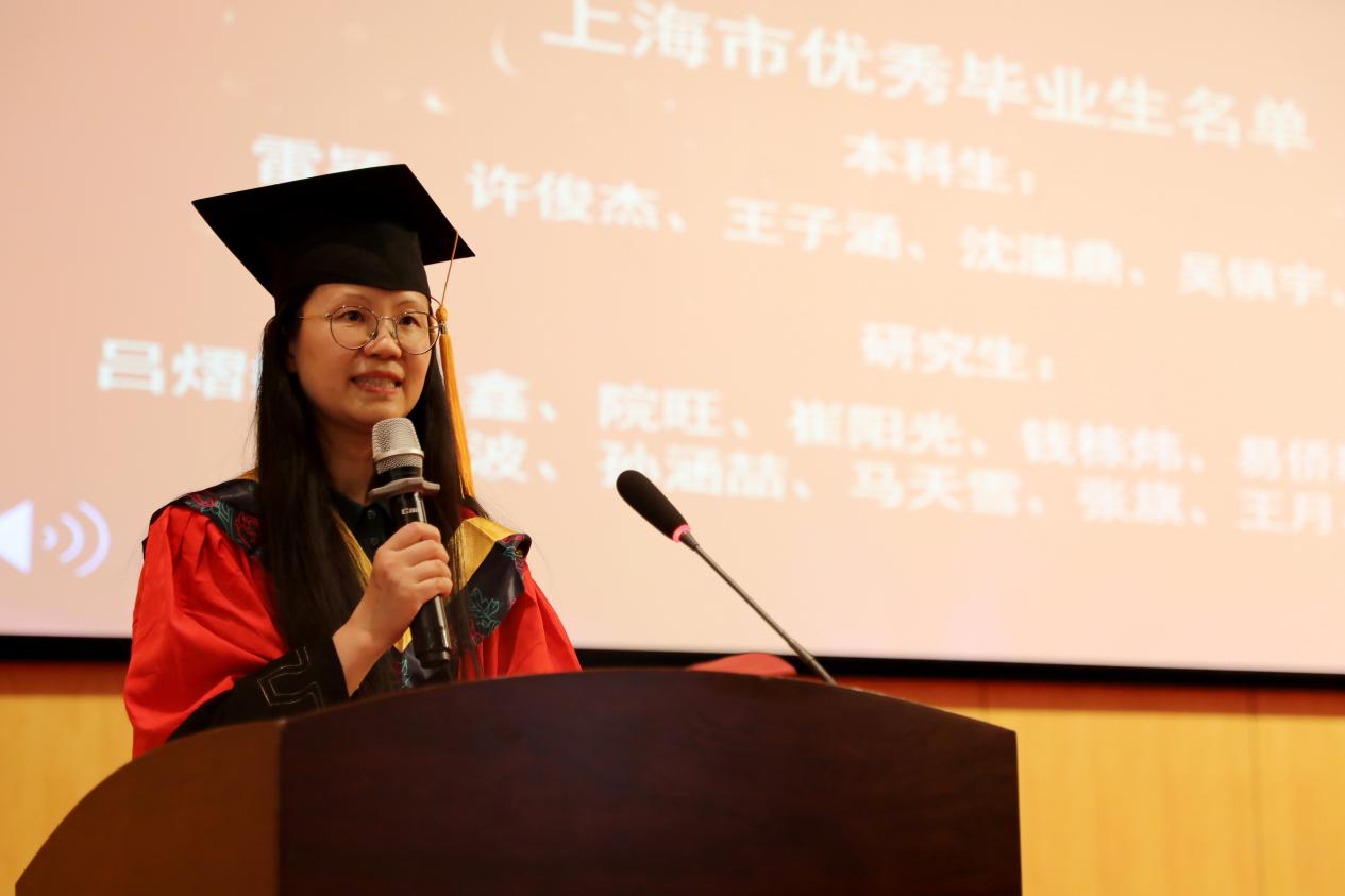 陈蕾宣读2023届市级优秀毕业生名单、校级优秀毕业生名单,余佳、陈蕾为优秀毕业生代表颁发证书。