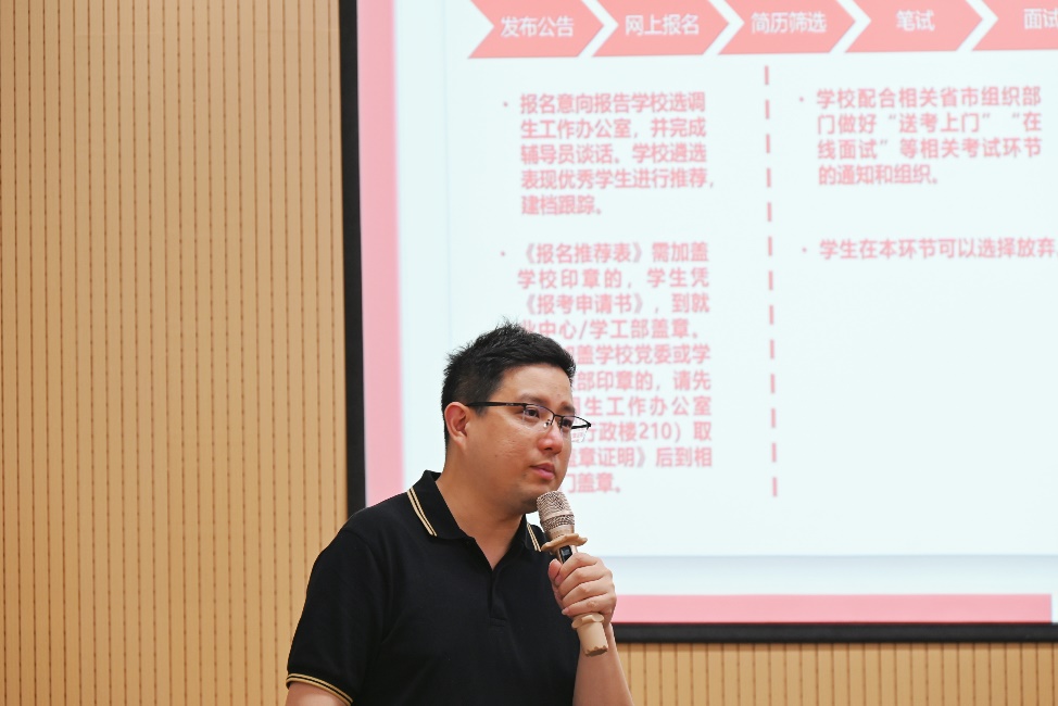 2023年6月6日下午,计算机学院职业生涯规划系列讲座选调专场在理科大楼B112教室举行。本次讲座邀请了校党委学生(研究生)工作部副部长、选调生工作办公室副主任章晶晶讲解选调的相关政策,选调生校友夏培之、高桢分享前期准备和工作感悟。