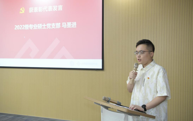 2021级专业硕士研究生党支部党员马圣进同学在发言中回顾了自己在抗疫期间从事志愿服务以及参加创新创业比赛的经历,表示作为一名青年党员,一定要奋力拼搏、立志成长,为实现伟大中国梦不懈奋斗。