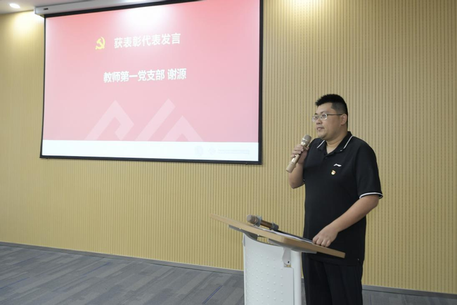 教师第一党支部党员谢源教授作为受表彰代表发言。他回顾了自己入职以来的成长历程,特别是疫情期间在教学科研岗位上的工作经历,表示将继续不忘初心、牢记使命,为党育人、为国育才。