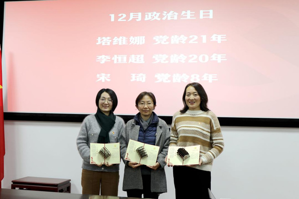 本次组织生活作为全年的总结,支委会向党员公开了全年党建工作经费使用情况,并设置了评优表彰、为党员过政治生日两个特色环节,对本年度学习强国学习标兵(学习积分超过10000分以上)的四位党员同志:塔维娜、韩璐、赵婧媛、张宏菊进行表彰,号召其他同志能够向学习标兵看齐,加强理论学习、不断提升政治素养。同时支部为12月份入党的三位党员同志塔维娜、李恒超、宋琦集体过政治生日。韩璐为分别为三位党员赠送政治生日贺卡、宣读生日寄语,在场的每位党员都为之动容,这种仪式感满满的活动,形式新颖又让人感动,让党员们铭记入党初心,激励全体党员继续发挥党员先进性,努力做好管理服务工作。