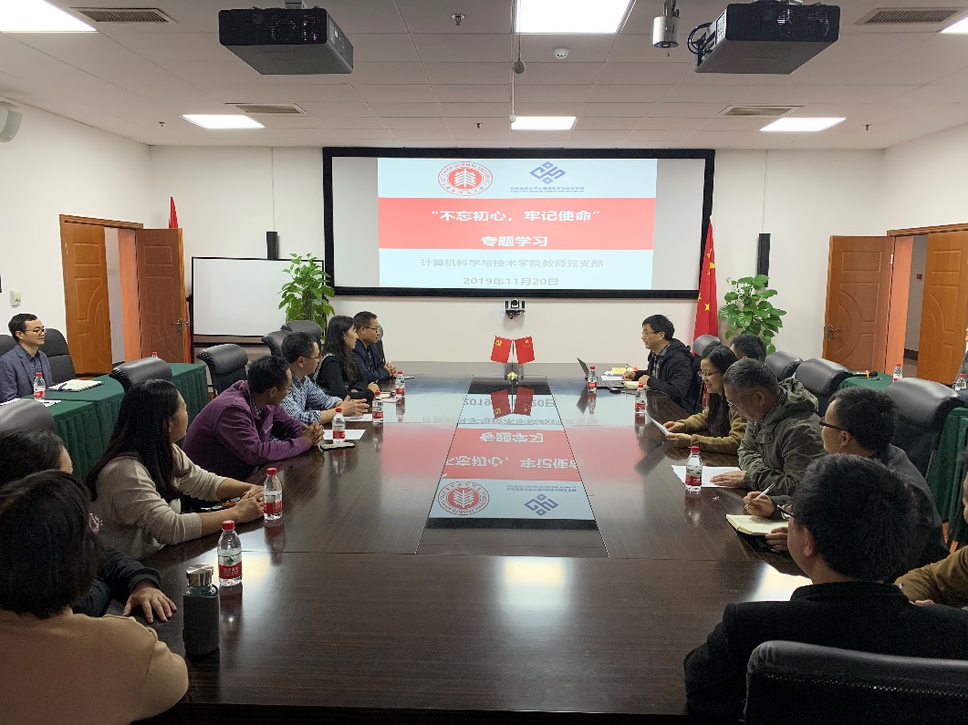 2019年 11月20日下午计算机学院教师党支部在理科大楼B504开展“不忘初心,牢记使命”主题教育学习研讨会。教师党支部26名党员参加研讨会,会议由党支部书记何高奇主持。