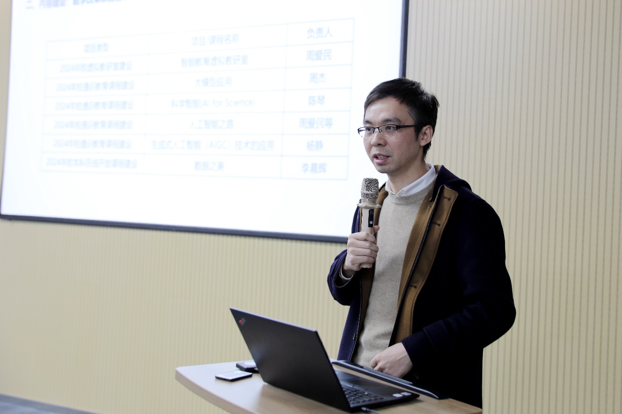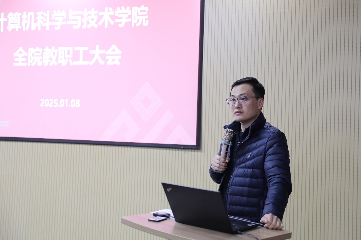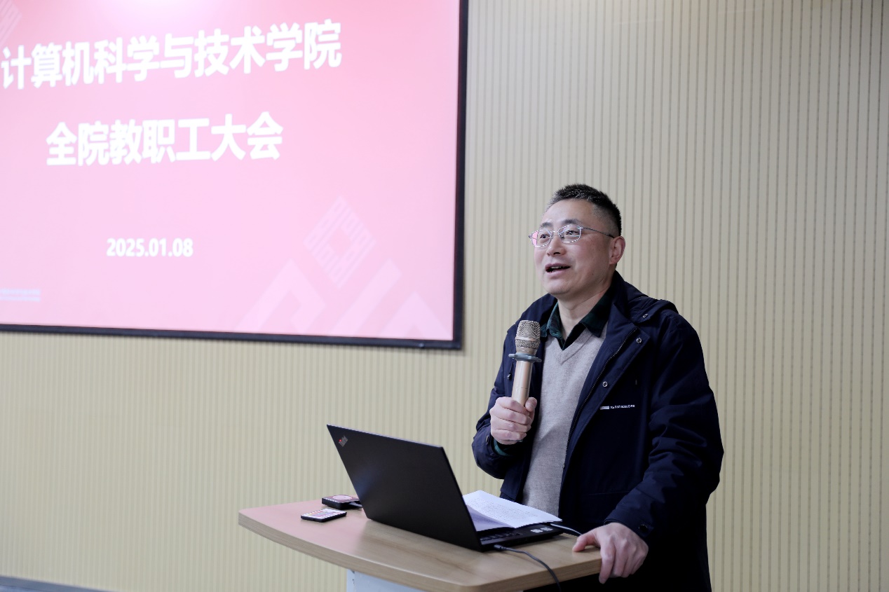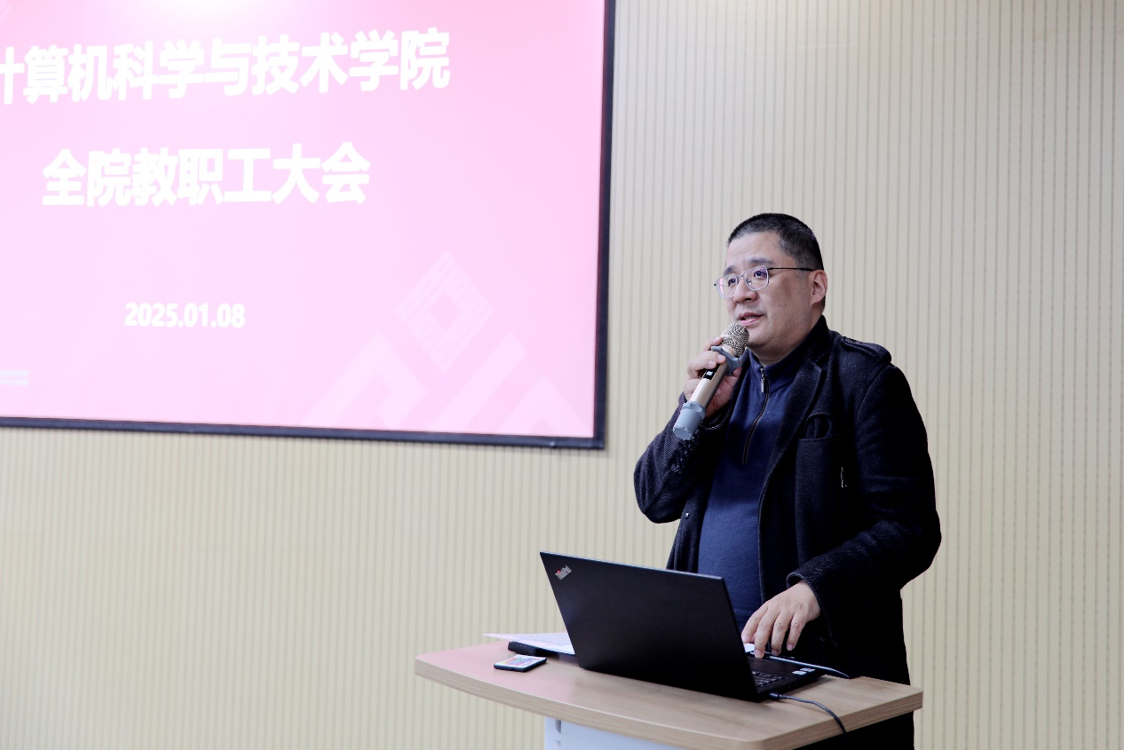 随后,副院长徐飞围绕本科人才培养做了发言。他重点介绍了计算机学科本科培养方案修订、内容建设、创新实践、智能教材建设、教学改革项目立项及教学奖项获得情况,展示了学院在创新教学方法和提升教学质量上的持续努力。他强调做好期末考试与试卷批改工作,确保教学管理的精准化与规范化。