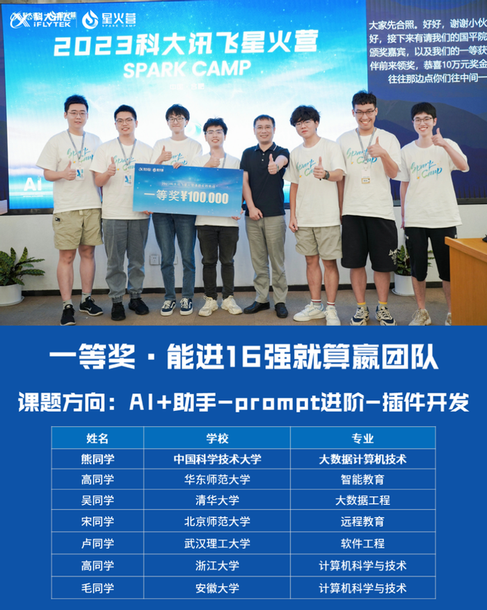 8月15日至8月25日,计算机学院、上海智能教育研究院智能教育专业博士研究生高峰、刘文涛,硕士研究生曾嘉怡赴合肥参加了由认知智能全国重点实验室联合人工智能领军企业科大讯飞股份有限公司举办的首届科大讯飞星火训练营Spark Camp。通过参与学习深度技术讲座与大师级培训课程+富有挑战性的项目课题实践等内容,高峰同学和所在团队“能进十六强就算赢”夺得了基础课题研究竞赛、项目课题实践竞赛(半决赛路演、决赛答辩)的双料第一,最终摘得2023科大讯飞星火营年度冠军的荣誉,并获得奖金10万元。科大讯飞高级副总裁、研究院院长胡国平为获胜小组颁奖。