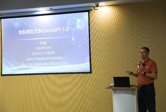 随后,化学与分子工程学院的何晓教授带来了题为“ChemGPT 1.0”的报告,聚焦于大模型在生物医药和分子智造领域的创新应用。何晓教授介绍了ChemGPT 1.0的架构和功能,阐述了其在化学合成反应、化学性质预测、逆合成路径规划等方面的突破性进展。他强调,ChemGPT 1.0不仅提高了分子设计和合成的效率,还通过智能合成平台实现了绿色高效的自动合成。