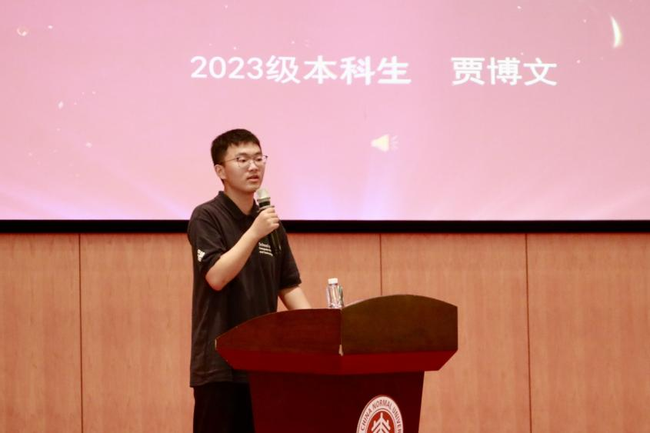 2023级本科生新生代表贾博文首先对入学以来,师长和同学们的关心与帮助表示感谢。他讲述了自己升入大学后激动的心情,期待可以在校园中一展拳脚,实现抱负。他也希望能与同学们并肩前行,不惧困难,争取做到不负家国期望,书写人生的华章,成为最炙热的火和最闪亮的星。