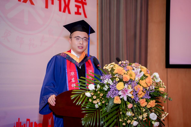 本科优秀毕业生代表孙翊铭、硕士优秀毕业生代表马圣进依次发言。孙翊铭同学表示在华东师大学会了思考与创新,更明确了人生方向,鼓励大家带着母校的教诲和期望,踏上新征程,未来不断追求卓越,为社会发展贡献力量。马圣进同学向一直关心爱护2024届毕业生的老师、家长表示由衷的感谢,表示过去的三年,是他成长最快的三年,鼓励大家继续传承师大精神,努力追求卓越!