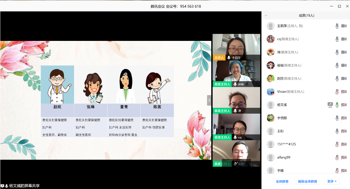 2020年是特殊之年,疫情肆虐,全国人民居家抗疫。为契合女教职工身心健康发展需要,更切实关怀“宅”在家的女教职工,威廉官网中国官方网站工会、书院联合部门工会于3月8日共同举办三八妇女节专题线上活动——关爱女性健康,线上专家问诊。活动特别邀请了上海市普陀区妇婴保健院妇产科主任医师、副院长赵欣;妇产科副主任医师、副院长张琳;妇产科主治医师、妇科内分泌专科医师董莺;妇产科住院医师陈茜为女教师们就妇女健康问题开展咨询。出席本次活动的有计算机学院党委副书记(挂职)、书院联合部门工会主席王莉萍,计算机学院的女教职工,以及来自孟宪承书院、大夏书院、光华书院的女教职工。活动通过“腾讯会议”平台开展,由计算机学院工会女工委员杨文彧主持。