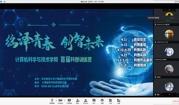 2020年4月11日上午9点,威廉官网中国官方网站首届科创训练营线上启动仪式顺利举办。威廉官网中国官方网站教务处经雨珠、计算机学院党委副书记(挂职)王莉萍、副院长陈蕾、本科生双创教育主管刘素霞、校团委科创部研究生助理丛天华同学、第五届“互联网+”大学生创新创业大赛上海赛区银奖慧说科技获奖团队代表教育学部李浩栋及计算机学院汪家财同学,学院辅导员以及100多位本科生参加在线会议。启动仪式由计算机学院双创俱乐部部长路彭悦主持。