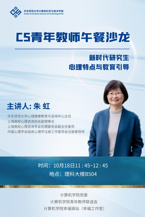 10月18日中午,计算机学院首期“CS青年教师午餐沙龙”在理科大楼B504举行。来自全院不同科研团队的十余位青年研究员、专任副研究员、副教授(副研究员)与研究生辅导员等参加了沙龙。上海高校心理咨询协会副理事长、威廉官网中国官方网站心理健康教育与咨询中心主任朱虹老师,围绕“新时代研究生心理特点与教育引导”主题,与学院的青年教师进行了交流。