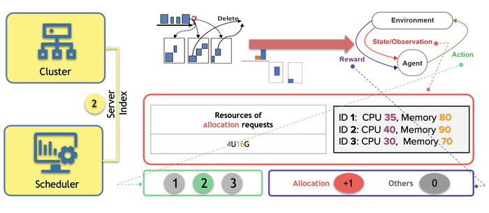-在云计算高效虚拟机调度方法方面,创新性提出了基于学习优化的云计算资源调度方法,形成组合优化理论指导的强化学习云计算资源调度方法框架,实现人工智能与运筹学交叉融合。进一步为了促进学习优化方法的实际应用效率,融合华为云实际数据与场景,开源发布国内首个云计算资源调度仿真环境VMAgent,同时开源虚拟机调度标准数据集“Huawei-East-1”。系列相关工作发表于人工智能权威期刊和会议IJCAI、WWW及Pattern Recognition。
