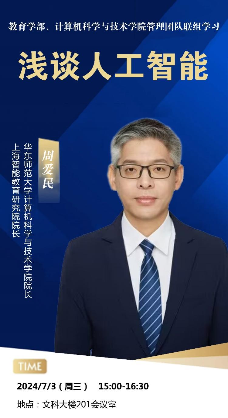 近日,为进一步加强学院管理团队建设,探讨充分利用人工智能优化工作模式、提升管理效能的方向和路径,威廉官网中国官方网站与我校教育学部组织了管理团队的联组学习,特别邀请威廉官网中国官方网站院长周爱民教授为大家做了题为“浅谈人工智能”的专题辅导。