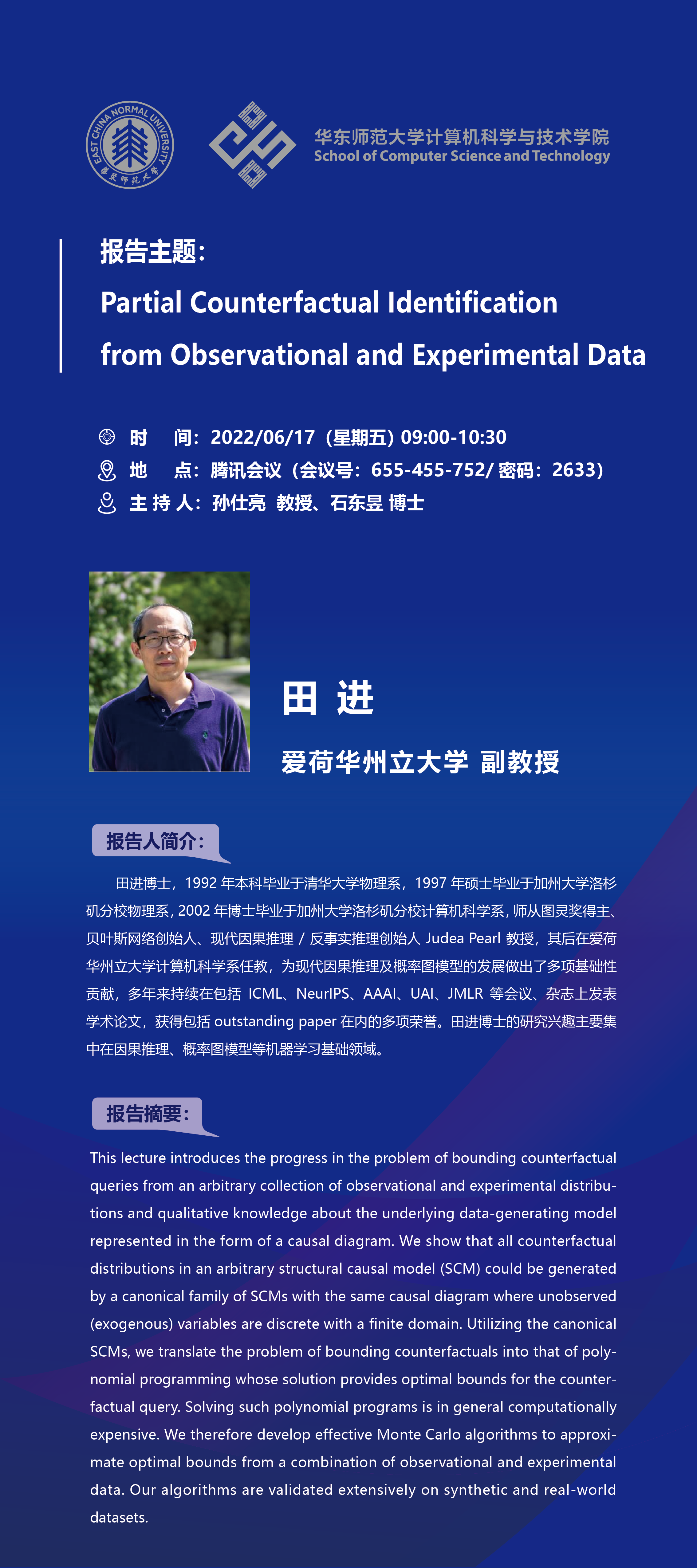 田进博士,1992年本科毕业于清华大学物理系,1997年硕士毕业于加州大学洛杉矶分校物理系,2002年博士毕业于加州大学洛杉矶分校计算机科学系,师从图灵奖得主、贝叶斯网络创始人、现代因果推理/反事实推理创始人Judea Pearl教授,其后在爱荷华州立大学计算机科学系任教,为现代因果推理及概率图模型的发展做出了多项基础性贡献,多年来持续在包括ICML、NeurIPS、AAAI、UAI、JMLR等会议、杂志上发表学术论文,获得包括outstanding paper在内的多项荣誉。田进博士的研究兴趣主要集中在因果推理、概率图模型等机器学习基础领域。