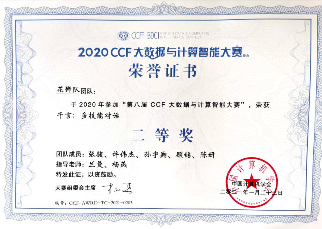 近日,由计算机学院自然语言处理(NLP)团队的兰曼和杨燕老师指导,张骏、许伟杰、孙宇翔、顾铭、陈妍五位研究生组成的竞赛团队,通过出色的模型设计和工程实现,喜获第八届CCF大数据与计算智能大赛二等奖。