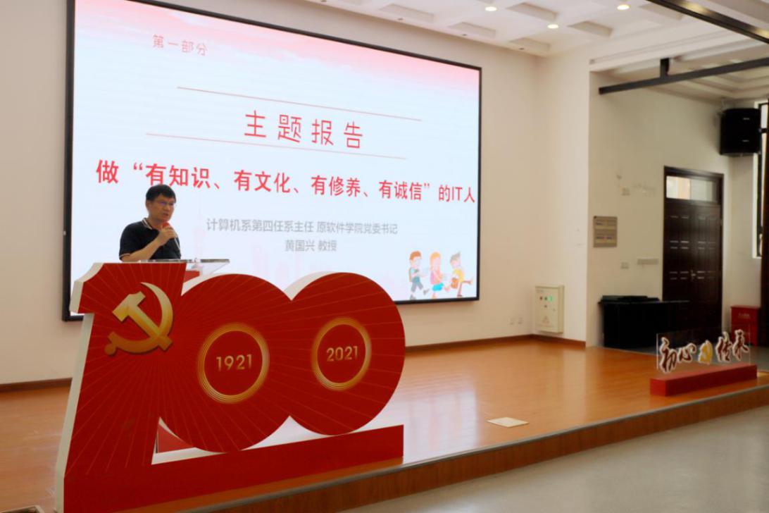 首先,计算机系第四任系主任、原软件学院党委书记黄国兴教授做主题报告。他结合自己的经历,提出了计算机学院所有毕业生应当以做“有知识、有文化、有修养、有诚信”的IT人为目标,黄老师从华东师大计算机学科的诞生历程讲起,那是一段闪闪发光的日子,计算机师生组建了第一台100系列的硬件容错计算机,并且在国家军工单位中实现了推广使用;使用早期C语言设计实现关系数据库;成功使用汇编语言编写出了适用于6000多人的企业管理系统,并因此获批成立计算机应用研究所。华东师大计算机学科经历四十年的发展壮大,在一代又一代师生的共同努力下发展越来越好。这启示我们要不断努力,传承计算机人艰苦奋斗、开拓进取的精神,不断丰富自己实现人生价值,对得起祖国和人民。