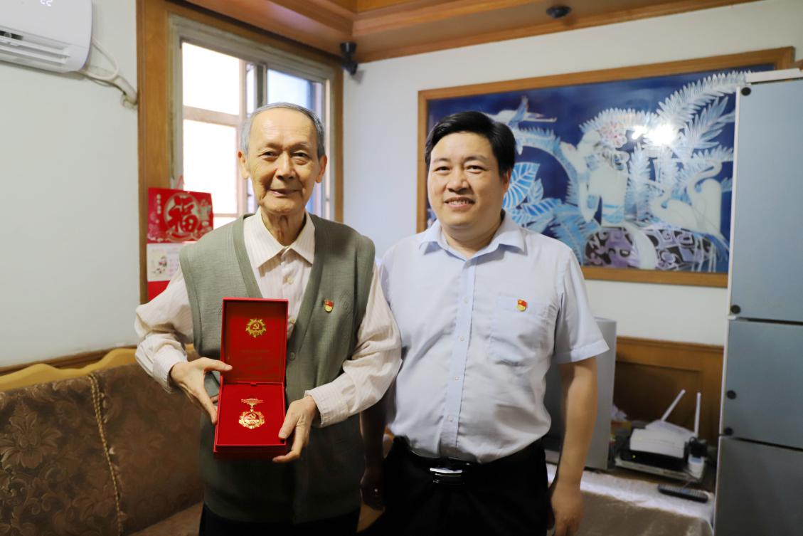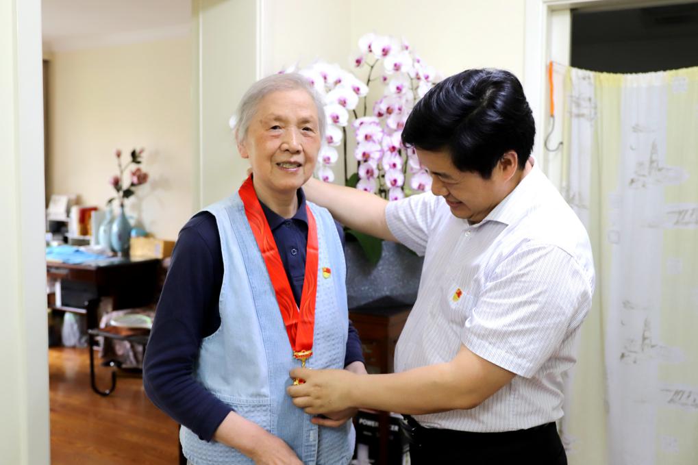 党委书记王长波为钱菊娣老师佩戴纪念章