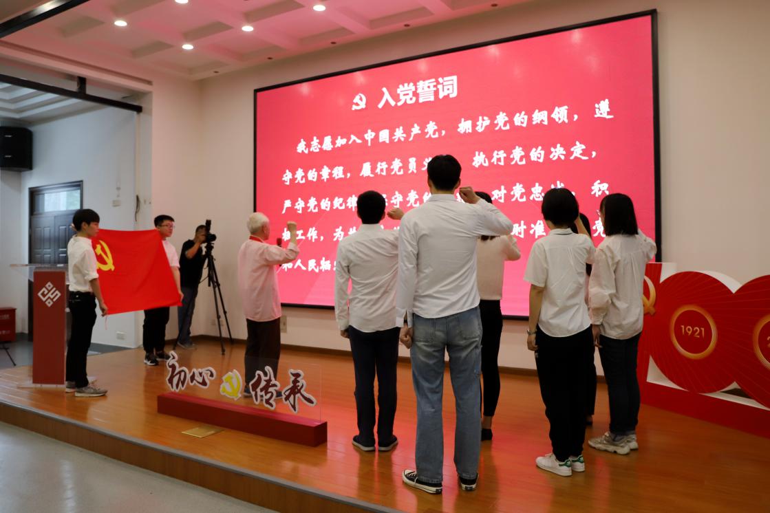 一代代计算机人的精神在党徽中传递、在誓言中传承,老党员们为新党员们佩戴党员徽章,在计算机系第三任系主任刘淦澄教授的带领下,新党员重温入党誓词。