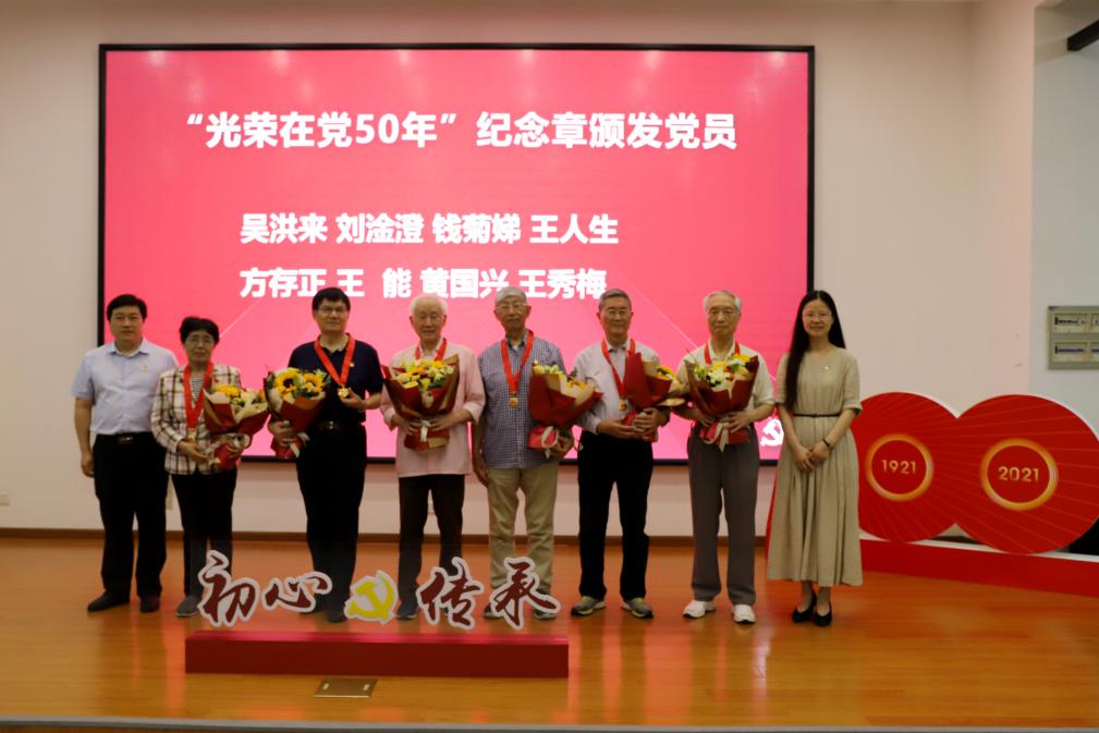 五十载初心如炬,征程路使命如一。活动开始,由王长波、陈蕾为六位到场的退休教师吴洪来、刘淦澄、方存正、王能、黄国兴、王秀梅颁发“光荣在党50年”纪念章,老党员们为计算机学科的发展做出了杰出贡献,华东师大首批终身教授、首届“上海市师德标兵”王能教授作为获奖代表发言,他表示这是党组织对过去工作的一种肯定,感谢党的领导,在建党百年这个特殊的时刻,老党员们要继续秉承初心使命,为青年人做好表率。学院党委高度重视纪念章的颁发,在前期已经上门慰问了钱菊娣、王人生两位老师并颁发了纪念章。