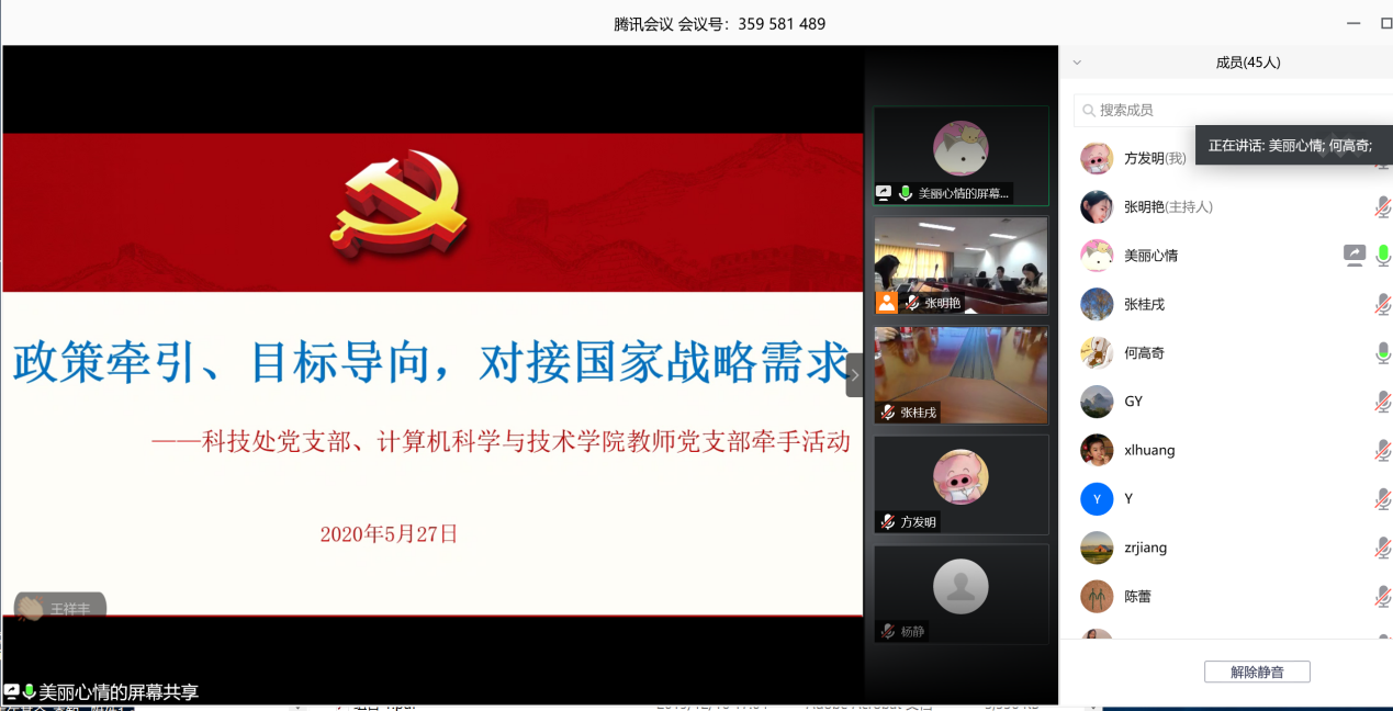 2020年5月27日下午,计算机学院教师党支部牵手科技处党支部,以“政策牵引、目标导向,对接国家战略需求”为主题开展线上组织生活会。活动由科技处党支部副书记陈美和计算机学院教师党支部书记何高奇共同主持。