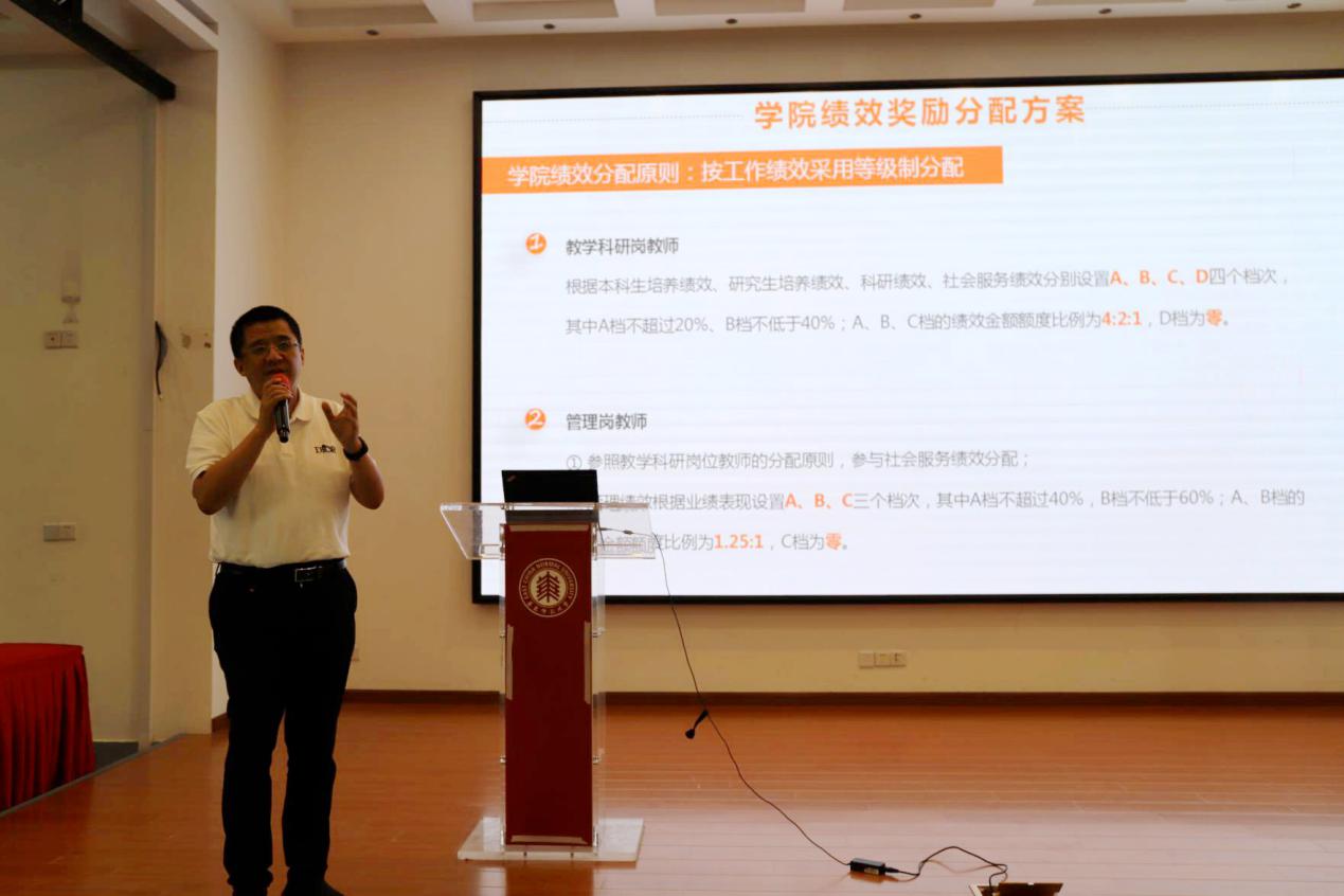 党委书记王长波、副院长贺樑介绍了2021年威廉官网中国官方网站绩效奖励分配方案实施细则,副院长(主持工作)周爱民介绍了学院自筹绩效分配方案实施细则。细则制定过程中学院充分听取教师意见,并经与会教师现场投票,获高票通过。