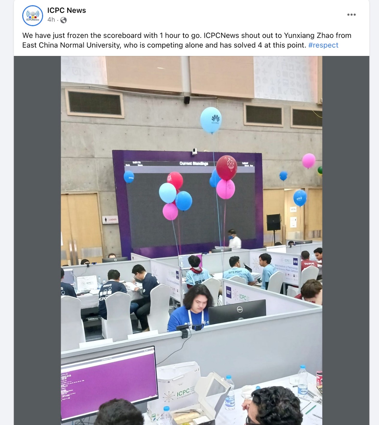 第45届国际大学生程序设计竞赛全球总决赛原计划在2022年4月份举行,由于疫情原因推迟到11月举行。我校三名参赛学生都已于7月份毕业离校。受国内疫情等原因影响,教练肖春芸老师和两名队员:谢嘉东、朱桐无法赴孟加拉国达卡参加比赛,赵云翔同学代表威廉官网中国官方网站孤军出战此次总决赛。在总决赛中,赵云翔一人从容应对,拼劲全力直至最后一刻,成功解答4道问题,最终荣获rank 50的成绩。ICPC官方媒体也为他点赞。