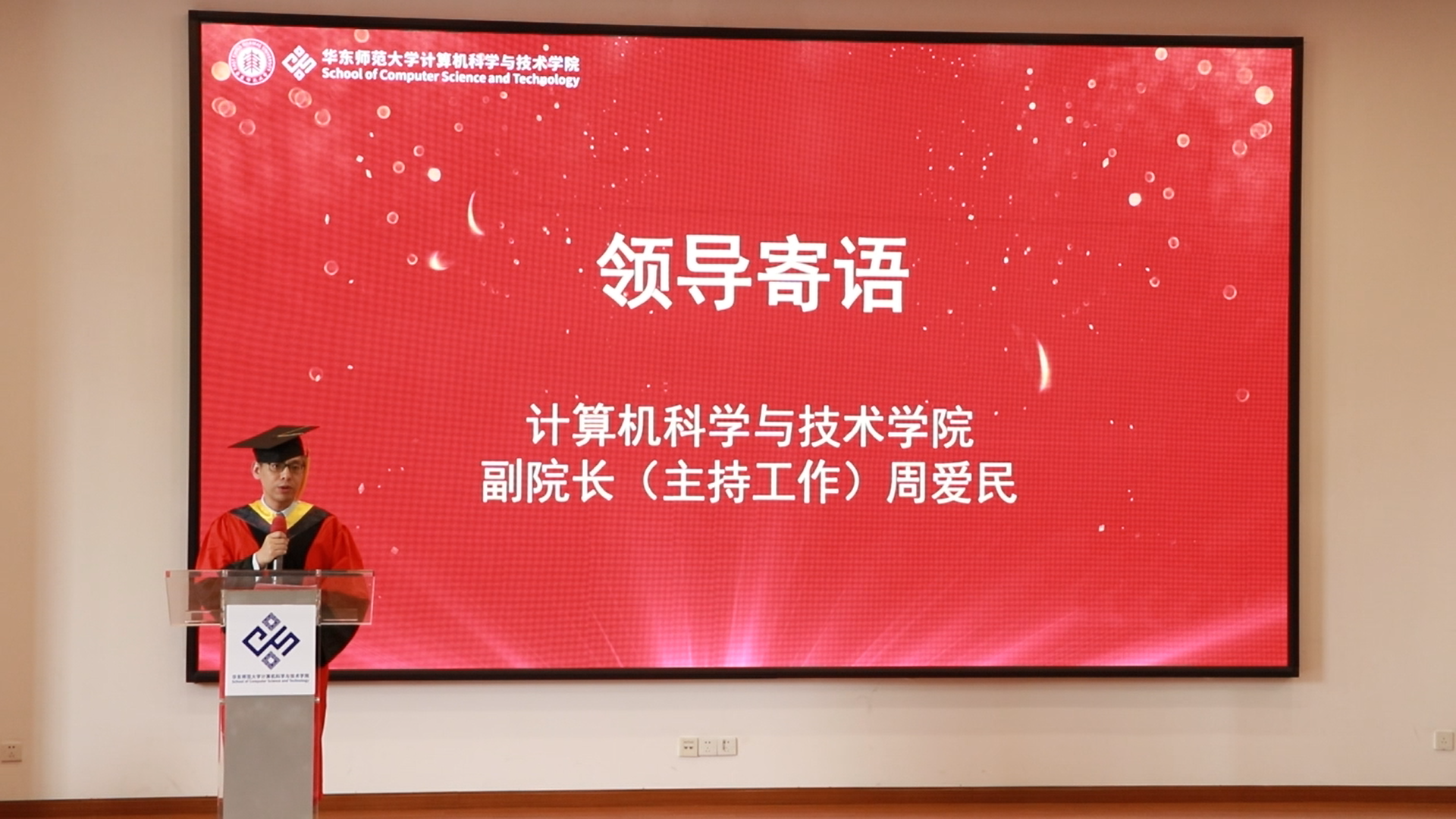 典礼最后,计算机学院的“大家长”周爱民副院长(主持工作)寄语毕业生。2020届毕业生是计算机学院成立以来的第一届毕业生,同时也是华东师大计算机系第38届毕业生,同学们是计算机学院艰苦奋斗、继往开来精神的传承者,是为计算机学院创造美好未来的开拓者。他为毕业生提出三点期望:一 ,胸怀家国,心有大我。青年兴则国家兴,青年强则国家强。决定人生高度的,最终将是理想与品性,是胸怀和对天下的责任。二,勤学终身,行稳致远。“吾生也有涯,而知也无涯。” 发扬精益求精、一丝不苟的“工匠精神”,在实践中增长工作本领,在知行合一中实现人生理想。三,初心如磐,感恩前行。始终把握好人生的“方向盘”,坚守自己的初心和梦想,坚持做你心里认定和喜欢的事,坚信“水到渠成”的力量。对父母、亲人、朋友,对母校、社会、国家永远怀有感恩之心。