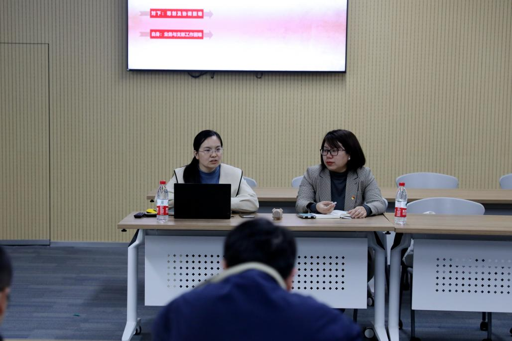 王长波介绍学校2023年度组织工作要点及学院党委的学期重点工作,他强调要以二十大精神学习为主线,积极做好校第十四次党代会的准备工作,不断促进卓越育人和学科高质量发展,支部工作要找亮点有特色,以党建引领促进中心工作发展。他对支部书记和委员提出了三点要求,一是要加强学习提升站位,二是要不断创新工作方法、改变工作思路,三是要团结协作,密切配合。