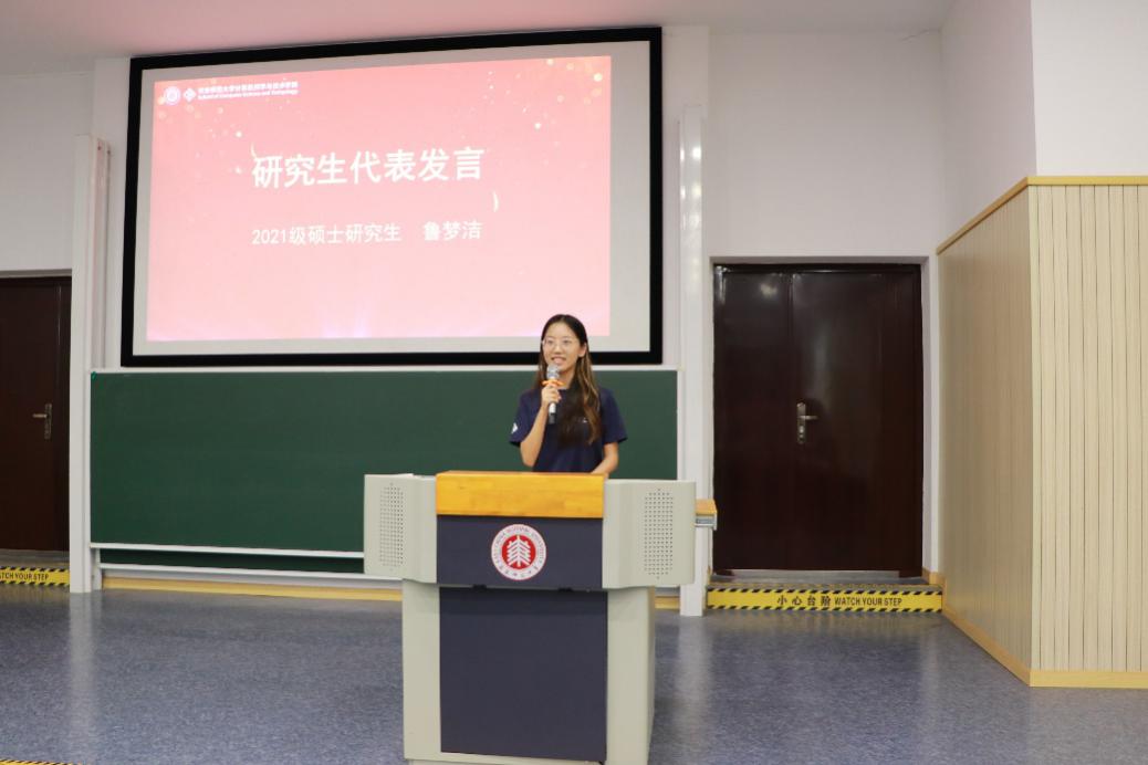“青春逢盛世,奋斗正当时”,2021级硕士研究生新生代表鲁梦洁作为师大人对学弟学妹表示祝福和鼓励,同时她表达了对研究生生活的期待,希望与全体新生共同进步、共同钻研,为未来的计算机学院创造更多辉煌!