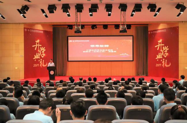 在庄严的国歌声中,2019级新生开学典礼正式开始。副院长(主持工作)周爱民首先向今年入学的本科生、研究生以及海外留学生表示热烈欢迎。紧接着,周爱民对华东师大计算机专业的历史沿革、专业概况、历年所取得的成就及未来发展目标进行了简要的介绍,并向新生提出三点期许:一是立志有为;二是发掘潜能;三是实干合作。“希望同学们树立远大的理想,把握新时期的机遇与挑战,用自己的所学推动民族和社会发展,用你的指尖去改变世界”;“传承师大精神,成为优秀的国家科技事业的建设者”。