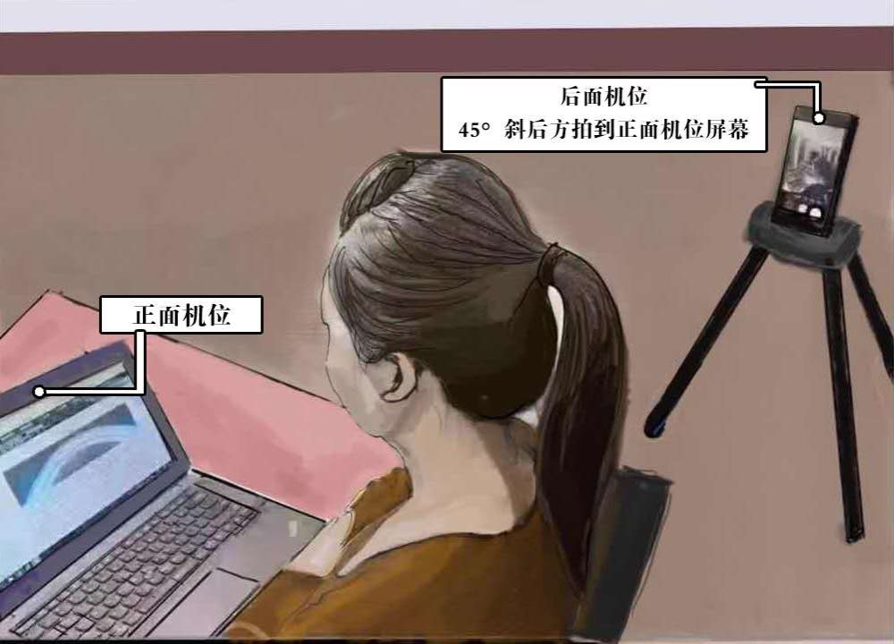 (一)“双机位”硬件:考生网络远程复试需双机位进行,使用电脑/平板和手机完成网络远程复试工作。双机位操作:考生双手摆放桌面,第一机位从正面拍摄,放置在距离本人30cm处,完整拍摄到考生双手以上身体部位。第二机位从考生侧后方45°处拍摄,可以拍摄到考生侧面及主设备电脑全屏幕,需保证面试考官能够从第二机位清晰看到第一机位屏幕。如下图所示: