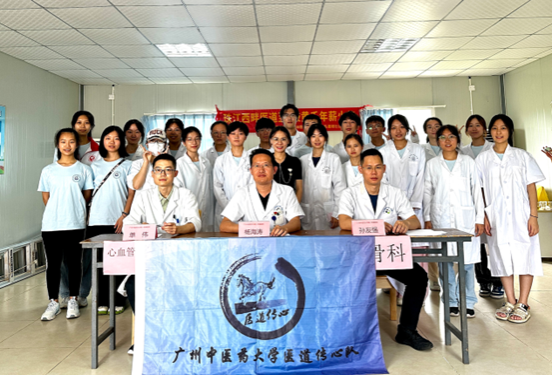 为了贯彻落实党的二十大报告中对中医药的传承创新发展,继承和发扬中医药在预防、保健、养生、康复等方面的独特优势,引领广大青年师生进基层、办实事,使广大居民享受便利的健康检查服务。广州中医药大学第一临床医学院(第一附属医院) (以下简称“广中医一院”)“医道传心”志愿者服务队携手本院专科(针灸科、骨科、心血管科)医生团队,联合黄阁社工服务站及大井村村委会,于 7 月 22日在广州市南沙区小虎村板房,开展“‘麒’心送温暖,中医便民服务”中医药文化进村居之“三下乡义诊”活动。