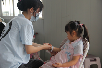 在医生们用自己精湛的医术为居民们解决难缠的问题时,“医道传心”志愿者服务队的医学生志愿者们用他们专业所学,为居民提供了推拿、品花茶、艾灸、量血压、贴耳穴等中医基础医疗服务。活动全程以粤语作为基本沟通语言,方便与居民交流,提高服务质量及居民对中医药文化的认识。在一言一语当中,能感受到居民对于中医保健都有着很大的热情,居民们也在义诊的途中表达并给予了志愿者们充足的信任,频频向志愿者们竖起大拇指。居民们大部分有定期检查和锻炼身体的习惯,从他们对身体的重视,可见他们对于健康身体的期盼。