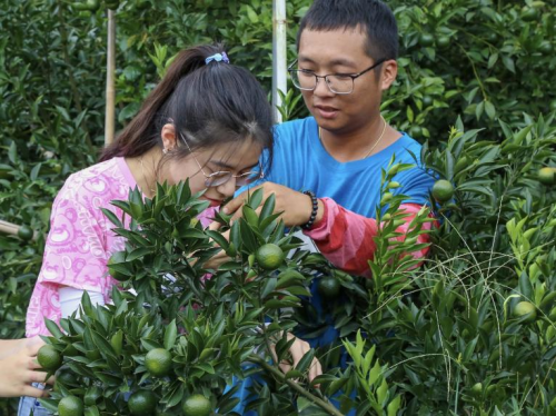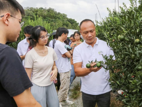 图为团队成员在工作人员的指导下,学习新会柑栽培技术