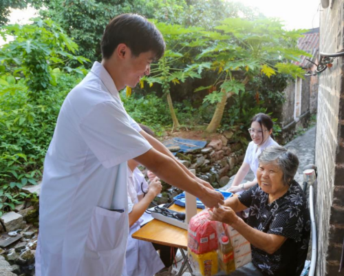 队员们则根据居民们不同的体质和需求,针对性地提供量血压、测血糖、艾灸、推拿、贴耳穴等基础医疗服务并在过程中积极宣传中医养生保健相关知识,增强居民们的健康意识,提高居民们对中医药文化的理解与认同。部分队员在村委干部的带领下前往行动不便的老人家中,为他们提供“上门式”基础医疗服务并送上纸巾、食用油等慰问品。队员们凭借着认真严谨的态度、专业娴熟的手法和热情细致的服务获得了当地居民的广泛好评。