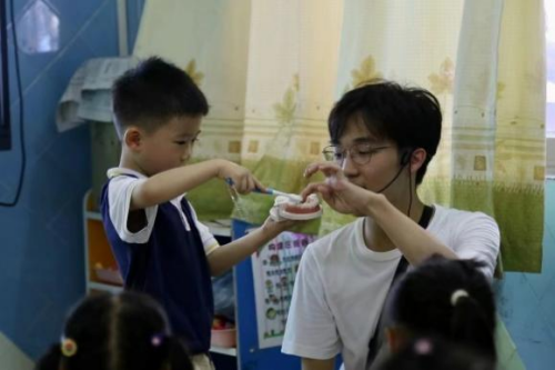 图为队员为小朋友们教授标准刷牙动作和七步洗手法