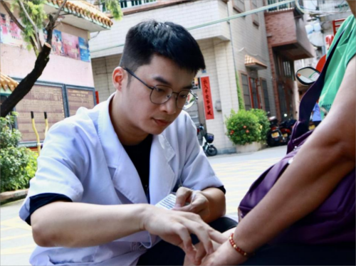 本次活动队伍有幸邀请了江门市五邑中医院江海分院针灸推拿科康莹医生和莫飞帆医生前来为当地居民提供专业义诊服务。康莹医生针对不同类型的疾病作专业的解释,为有需要的居民提供推拿按摩服务;莫飞帆医生望闻问切、辨证施治,运用针灸疗法为居民们排忧解难。医生们将中医特色疗法应用于义诊中,在强化居民养生保健意识的同时弘扬中医药文化。
