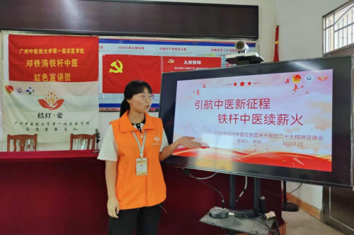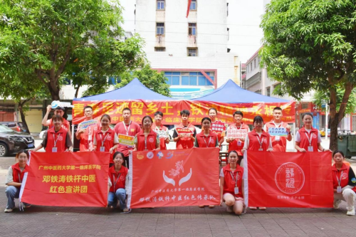 【一院讯】为深入学习贯彻习近平新时代中国特色社会主义思想和习近平总书记对中医药发展工作作出的“传承精华,守正创新”的重要指示,并将主题教育学习成果转化为助力中医药发展的生动实践,广州中医药大学第一临床医学院邓铁涛铁杆中医红色宣讲团的青年们不忘“中医人”的使命,不忘习总书记对当代青年的希冀,将红色故事与专业知识相结合,于2023年7月-8月暑假期间为各地人民群众开展铁杆中医红色文化主题宣讲,切实做到“弘扬国粹为己任,赓续血脉砥砺行”。而今年也是邓铁涛铁杆中医红色宣讲团开展暑期下乡宣讲的第三年。三年如一日,宣讲团成员们始终牢记初心使命,在传承红色精神基因、传播优秀中医药文化的道路上行而不辍,履践致远!