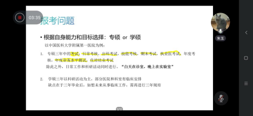 不知不觉,考研100天倒计时悄悄到来,各位同学正在紧张备考中,孜孜不倦,只争朝夕。在这最后的冲刺阶段,同学们难免产生的各种思想困扰和情绪问题,面对未知带来的迷茫困惑与复习伴随的焦虑敏感,在这最后三个月的冲刺阶段,心态调整与把握复习要点十分关键。2023年9月28日晚上七点,一院2019医学影像班举办了考研冲刺经验分享会,邀请到上一届考研上岸的优秀师兄师姐,向同学们分享如何调解复习心态和各科最后的复习方向。