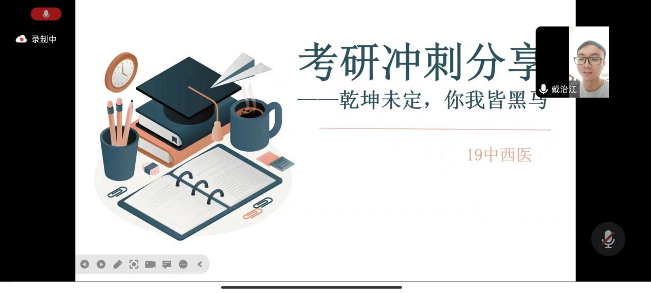距离2024年考研还有73天,为帮助我院2019中西医班同学进一步明确冲刺阶段复习方向,坚定冲刺目标,缓解紧张焦虑情绪,10月11号晚8点,一院2019中西医班组织开展线上考研冲刺分享会,我们再次邀请了2018中西医两位优秀师兄师姐为大家分享经验,本次会议由学习委员林泽君主持,辅导员邱敏老师及2019中西医班同学参与。