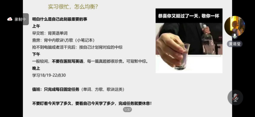 接下来进行分享的是黄璐莹师姐。政治方面,师姐提出十月后可看相关老师的线上课程,十一月背诵选择题,十二月背客观题,要着重把握基础部分。英语方面,师姐推荐使用不背单词app和欧路词典背诵单词,师姐还建议十一月之后最好开始计时分类刷题,模拟考试时间分配,做到心中有数。关于中综复习,师姐对不同的科目也提出了相应的复习建议。例如,方剂复习,师姐强调,要重视治法证型,不能只背方歌。中内着重背歌诀,不需太花时间在偏难怪的部分。中药需要重视不同中药的横向以及纵向的对比与总结。中基中诊则以做真题为主,通过总结错题、失分点来背诵。针灸的重点在于特殊穴、治法、腧穴位置等,主穴和配穴可以通过自己编歌诀的方法记忆。至于背诵进度最好是各科同时进行,齐头并进。最后是如何平衡实习、复习的问题。师姐强调,需要灵活应用碎片时间,不提倡夜战复习,不宜仅关注学习时间,要更注重学习效率以及任务的完成情况,做到张弛有度,踏实走好每一步路。无论考场上出现什么情况,都要保持良好的心态,一定要相信自己。