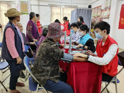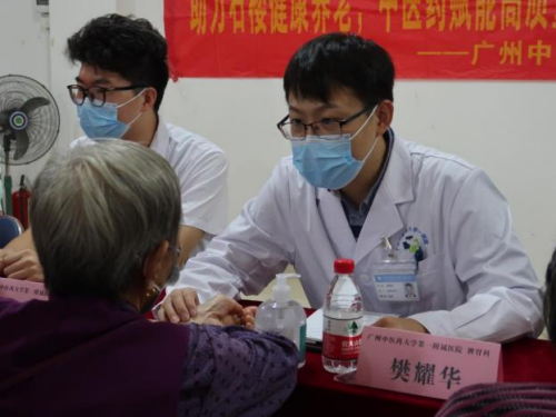 在志愿者们忙碌于布置现场时,石楼镇群星村党群服务中心便已有村民早早在现场等候。本次活动邀请到广中医一附院脾胃科樊耀华医生及呼吸科研究生吴文玉开展义诊。活动准备就绪,村民们纷纷向前问诊咨询,医生们时而低头仔细倾听村民的诉说,时而拿出听诊器认真听诊,时而伸手专注把脉……医生们细心周到的问诊服务为村民们解除了疾病困扰,也收获了村民的声声感谢;在旁的学生志愿者们也积极发挥自身专业优势,科普医疗知识,提供量血压、推拿、贴耳穴等基础医疗服务,用心服务到每一位群众。本次中医特色医疗服务让秋冬养生保健的意识深入民心,收到了在场群众的一致好评。