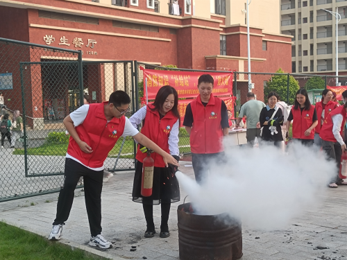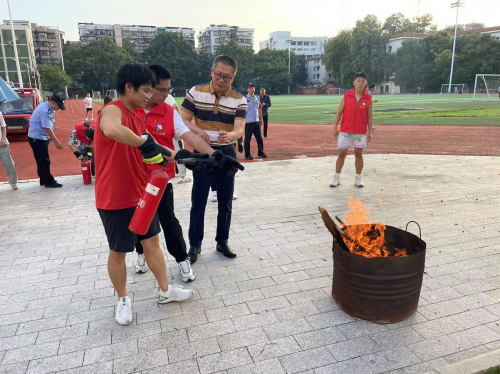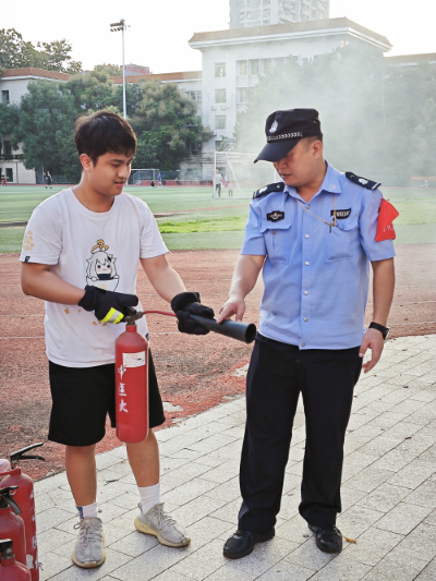 (保卫处老师与学生党员指导校园师生正确使用灭火器)