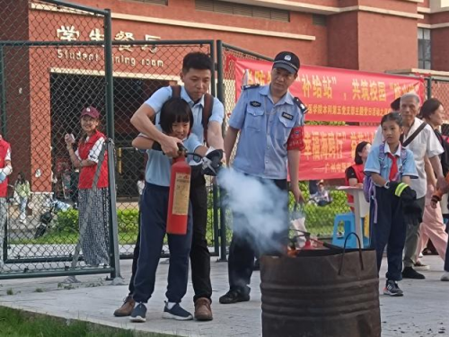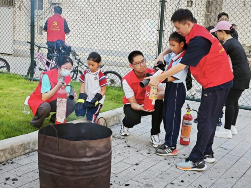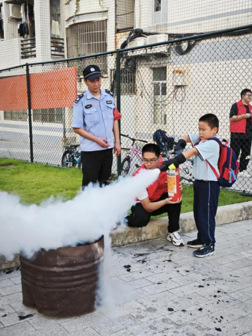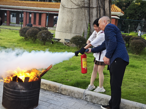 现场活动最“热火朝天”的便是灭火器使用教学与演练环节。为了模拟真实的火情灭火现场,在保卫处工作人员的安全操作与监督下,场边燃起了亟待扑灭的两团热火。从戴好防护措施到最终干冰喷射而出,工作人员全面细致的讲解充分保障了参与人员的安全与学习掌握程度。场边的参与者们皆跃跃欲试,演练处瞬间排起了长龙。“同学,灭火时要站在上风口,距离火源1-2米”、“同学你的手要这样拿,对对,用力按!”在保卫处工作人员和协助的学生党员们的耐心指导帮助下,上到老人家,下到小朋友,都亲身学习体验了灭火器的正确使用。大家意犹未尽,表示此次演练非常实用,收获良多,希望以后有更多这样的活动。