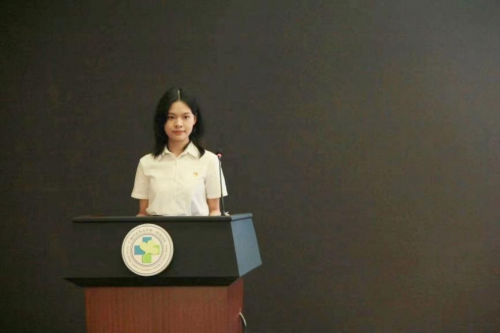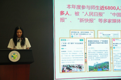 首先,一院学生团委实践部部长邓雨桐进行年度社会实践总结汇报。她从学院组织管理、感悟红色血脉、中医药义诊服务、特色文化宣讲、助力乡村振兴、志愿风采等六个方面,回顾并总结了本年度学院社会实践工作的开展情况,展示了一院师生扎根基层、关怀社会的责任与担当。