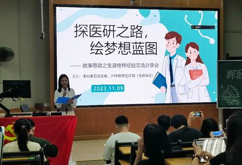 为了帮助进入大四年级的本科生尽快明确生涯发展目标,了解考研推免规划技巧,营造良好的学习氛围,第一临床医学院本科第五党支部联合2020级中医学五年制专业于11月9日19时在三元里校区办公楼三大课室举办了“探医研之路,绘梦想蓝图”故事思政之生涯榜样经验交流会。