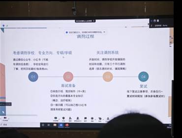 个人分享之后,是同学们满怀期待的交流环节。在场的嘉宾除了解答会前同学们提交的问题清单外,还耐心细致地解答了同学们的现场提问。师兄师姐们毫无保留的经验分享使同学们受益匪浅,不仅对考研、保研有了系统的了解,也对其中应该掌握的技巧和需规避的问题有了清醒的认识。