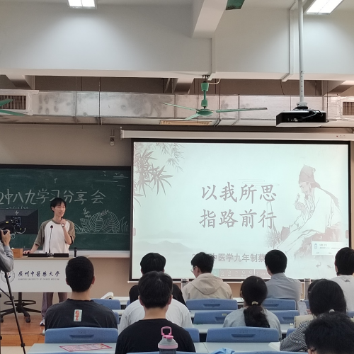 2023年11月24日,由2022级中医学八九年制举办的“凝心聚力共奋进,砥砺前行再扬帆”故事思政之生涯榜样学习交流会在广州中医药大学大学城校区教学楼A209教室顺利举行。本次活动有幸邀请到了2023级中医史文献系硕士张驰名、2020级中医学九年制蔡嘉铬莅临现场分享自己学习生活故事,年级辅导员何诗诗及2022级中医学八九年制(精诚班)87名同学参与本次学习交流会。