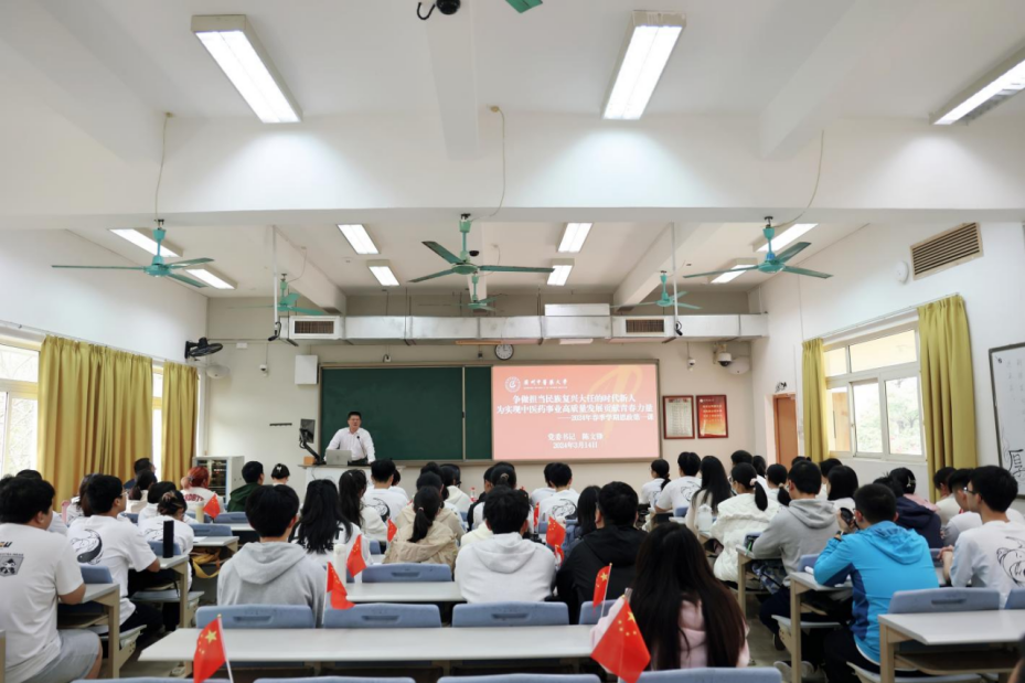 3月14日下午,学校党委书记陈文锋为第一临床医学院2023级中医学1班的同学们讲授了以“争做担当民族复兴大任的时代新人,为实现中医药事业高质量发展贡献青春力量”为主题的“思政第一课”,教导青年学生要坚定理想信念,激励大家勇担历史使命,争做新时代的好青年。