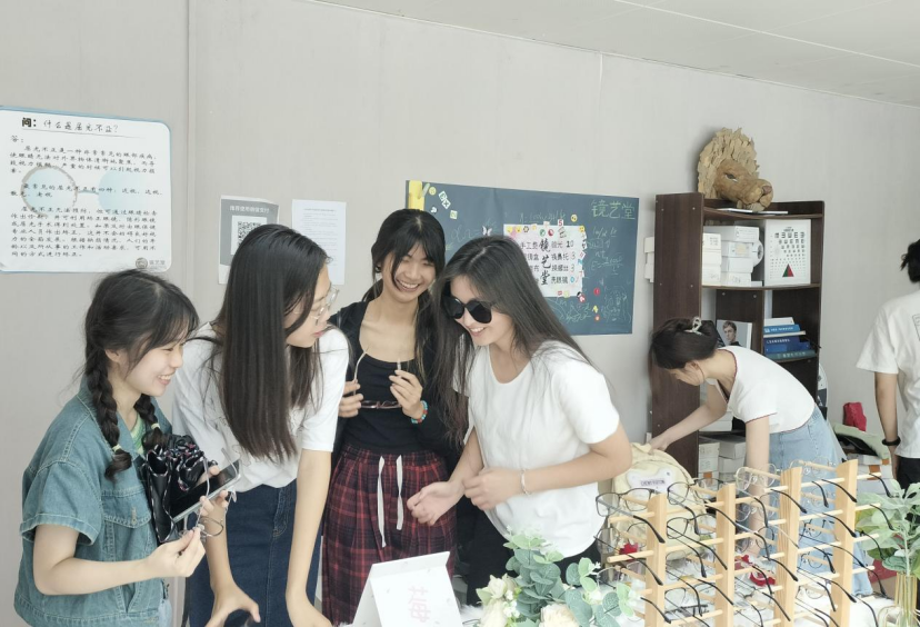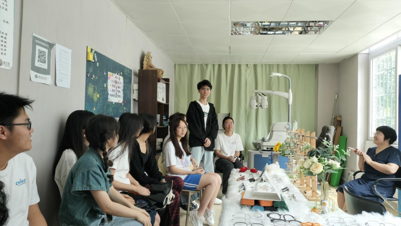 师生一行18人到达镜艺堂后,镜艺堂负责人李颖和何庚杨同学为大家介绍了镜艺堂的基本情况、运营模式、主要仪器及目前取得的成果,邀请大家体验了优质、免费的验光和清洗眼镜服务。随后,刘老师对镜艺堂的发展提出了宝贵的建设性意见,在场的班委也分享了自己的感受和建议。